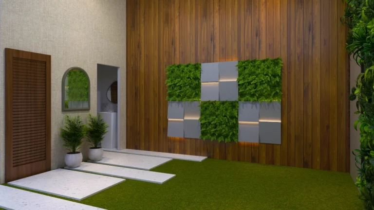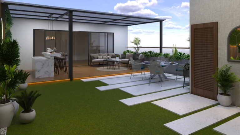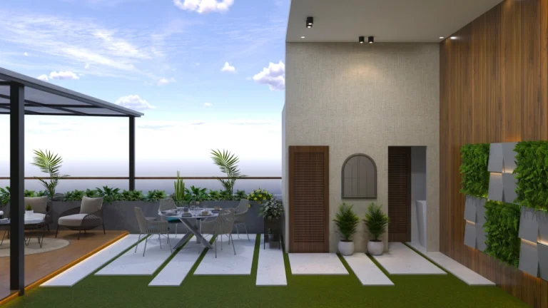 With the open sky above and panoramic views of the Bangalore skyline, this space feels expansive and connected to nature. The terrace is anchored by natural stone flooring and warm wooden elements, creating a welcoming atmosphere. The vibrant vertical garden offers a lush backdrop to the bar. Soft ambient lighting adds warmth, creating a cozy and inviting atmosphere as day transitions into night. Designed for both socializing and solitude, this terrace is an elegant fusion of luxury, nature, and urban beauty, providing a peaceful sanctuary right at home!